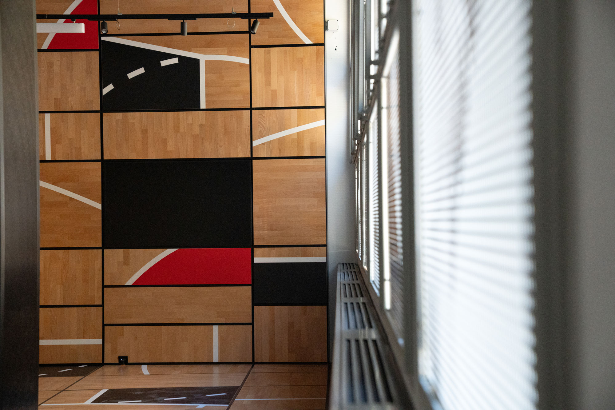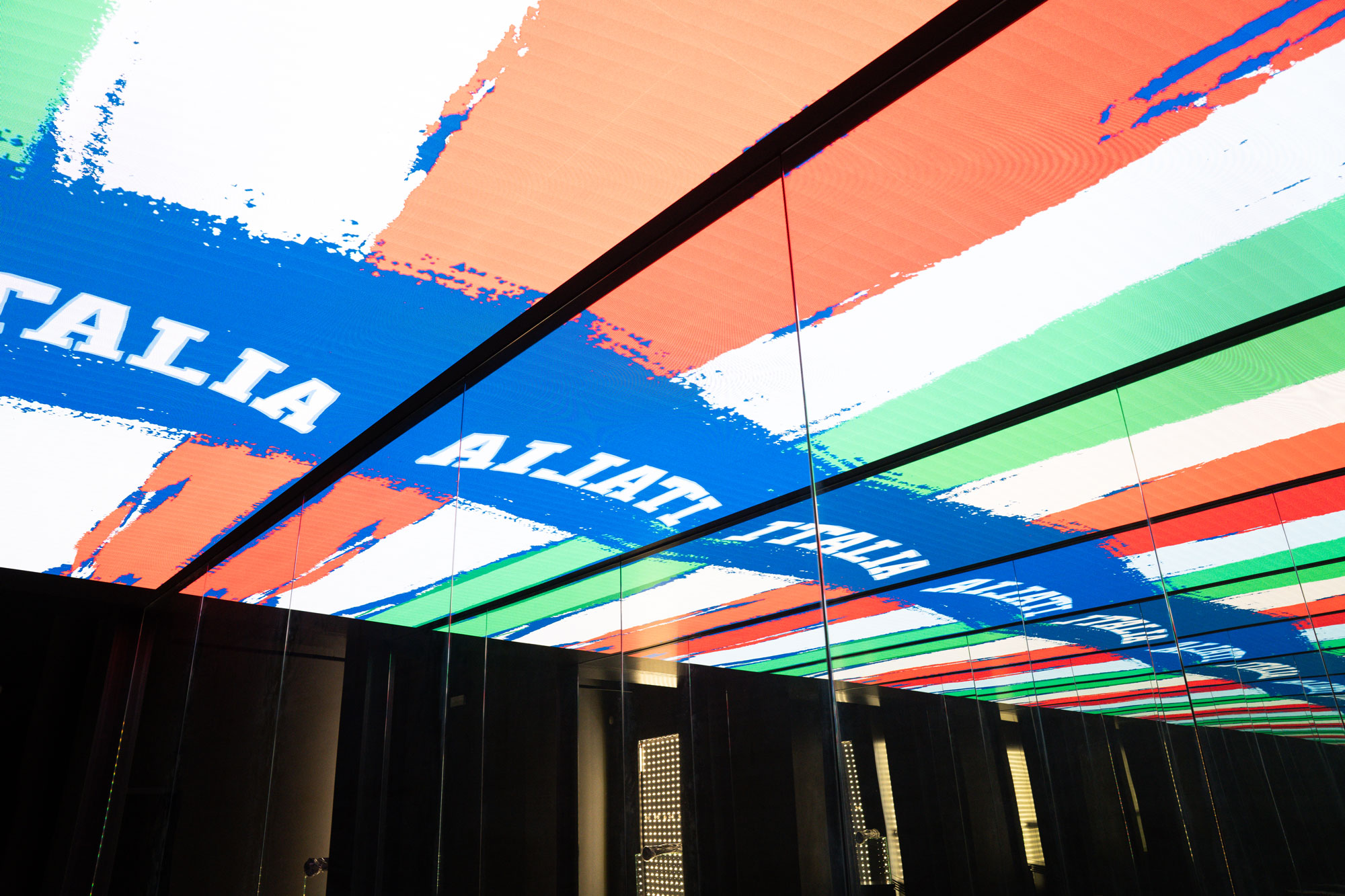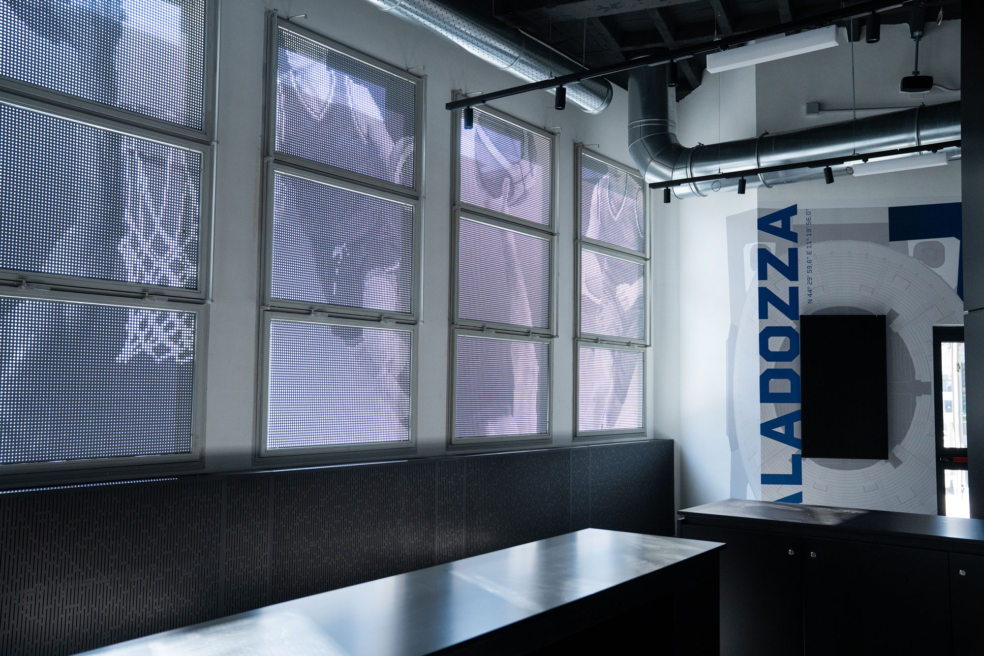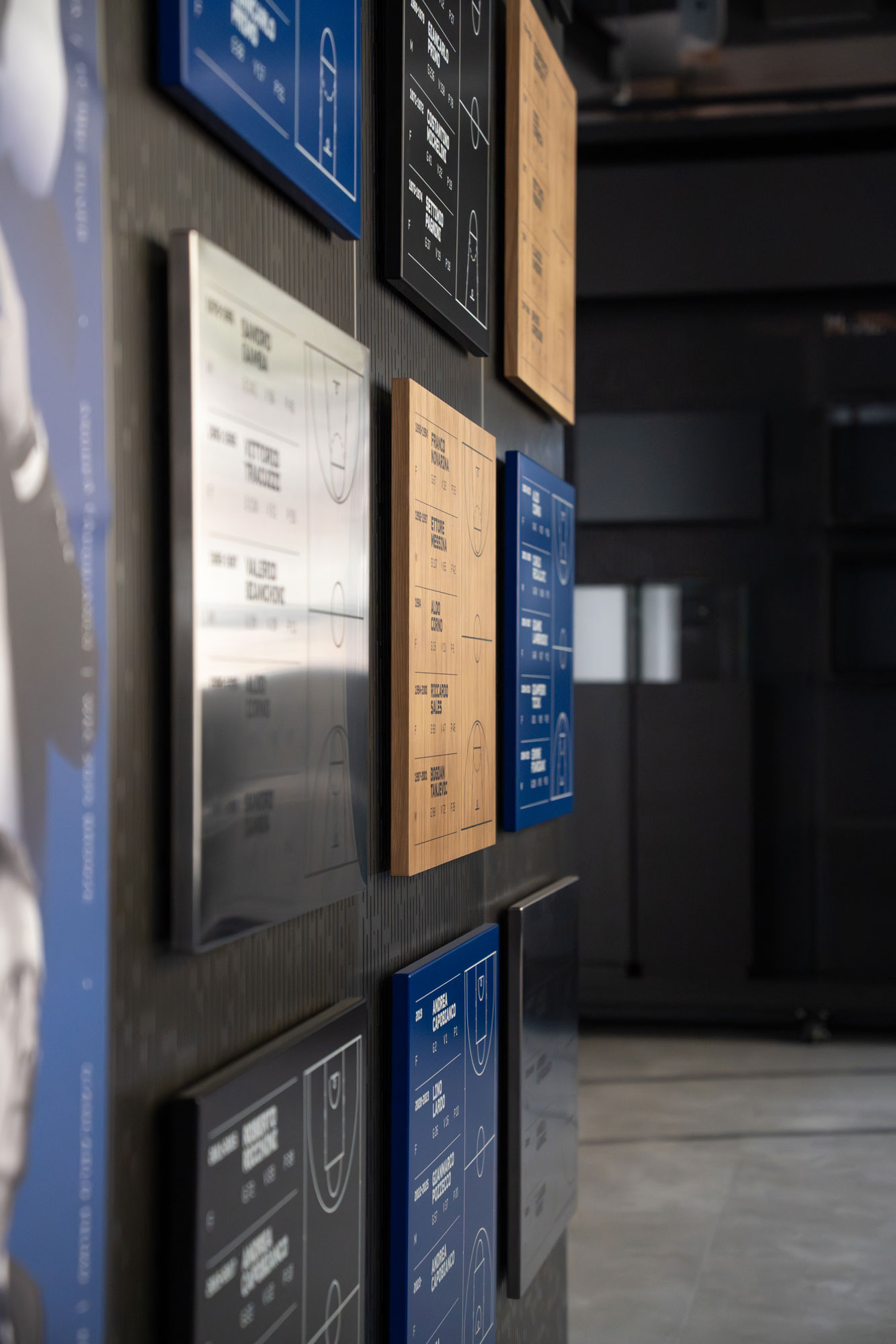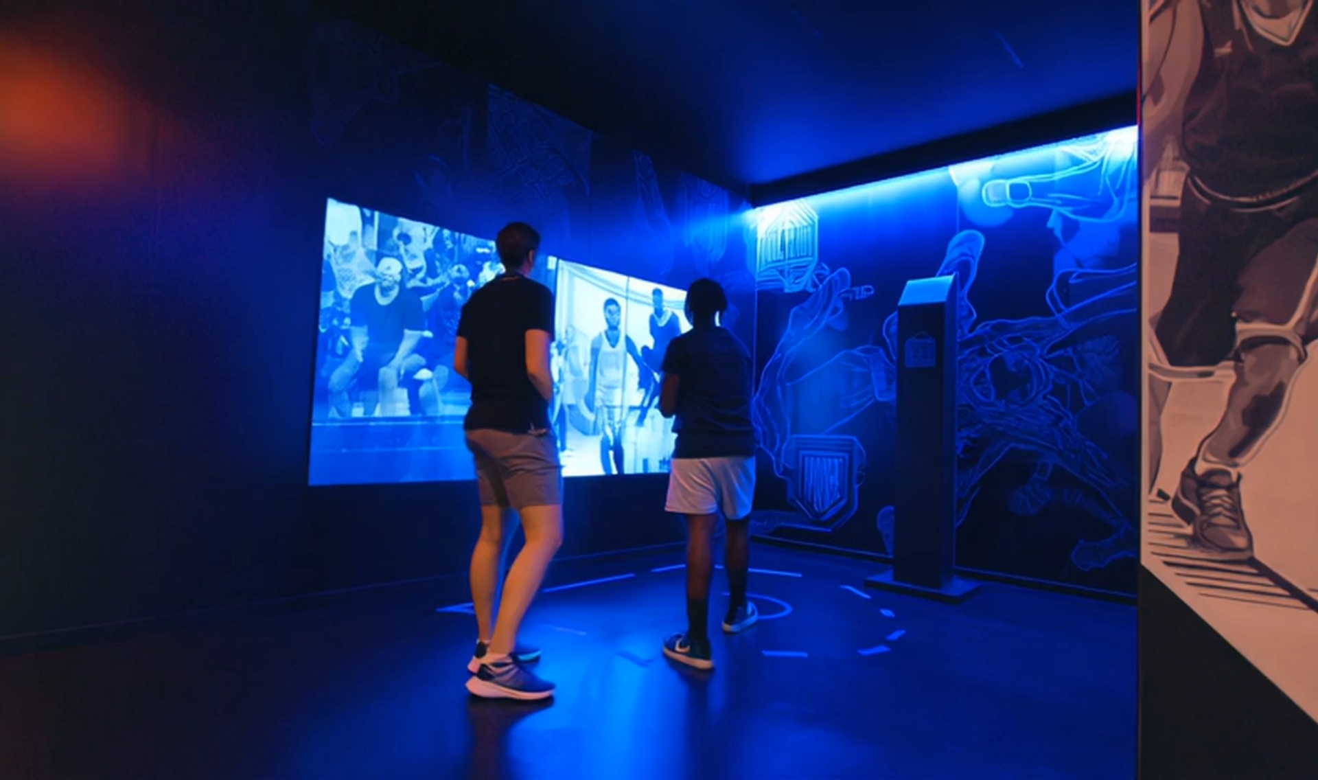 Pareti che prendono vita con proiezioni dinamiche e video-wall che trasmettono le grandi azioni della storia del basket.